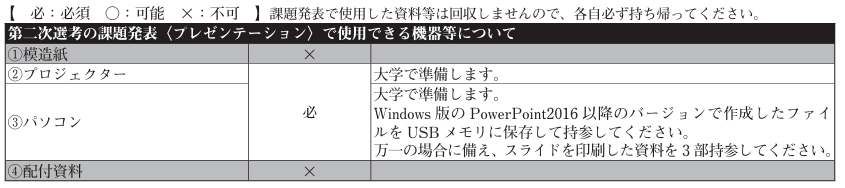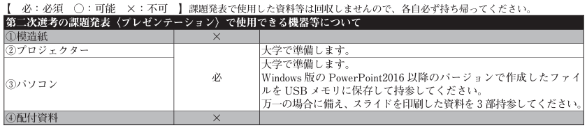 課題発表では、第一次選考の際に提出した課題について発表します。発表は原則としてパソコンを使用して行います。発表時にはメモを使用することはできますが、原稿の棒読みは避けてください。Microsoft PowerPoint(Windows 版 2016 以降のバージョン)に課題内容をまとめ、ノートパソコン(Windows)を用いて発表します(スクリーンや壁に投影しながらの発表となります)。ノートパソコンと液晶プロジェクターは大学のものを使用します。作成したファイルをUSBメモリに保存して持参してください。なお、データ消失などの万一の場合に備えて、内容をA4用紙に印刷して3部持参してください。