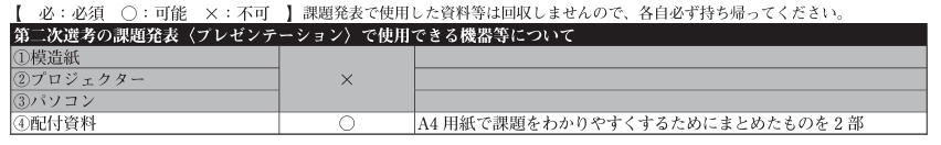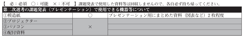 課題発表では、第一次選考の際に提出した課題について発表します。発表の際には、手元の資料として、第一次選考出願の際に提出した課題のコピーやメモなどを見ても構いません。補助資料として、課題をわかりやすくするためにまとめたもの(A4用紙)を準備しても構いません。