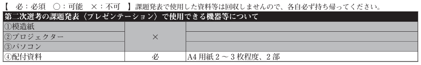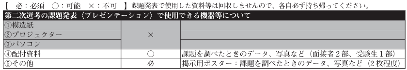 課題発表では、第一次選考の際に提出した課題について発表します。発表の際は、口頭でわかりやすく説明してください。単に原稿を読みあげるのではなく、課題を調べたときのデータ、写真を示すなどの工夫をしてください。ただし、示すことのできる資料は紙類のみとします。第二次選考の課題発表で使用できる機器等は以下のとおりです。